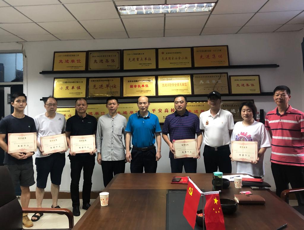 会上,黄松柏处长传达了学校新学期工作会议的精神;粟仁良副处长对下半年的工作进行了安排;李峻清副处长宣读了湖南省公安厅《关于表彰2018—2019年度省级治安保卫重点单位保卫工作先进集体和先进个人的决定》;夏曙光副主任宣读了2019年度考核优秀人员名单;刘远志书记宣读了2019年度保卫处优秀共产党员名单,并进行颁奖。黄松柏强调,全处同志要以先进个人为榜样,工作中履行职责,努力做好本职工作,为学校的安全保卫工作贡献自己的力量。