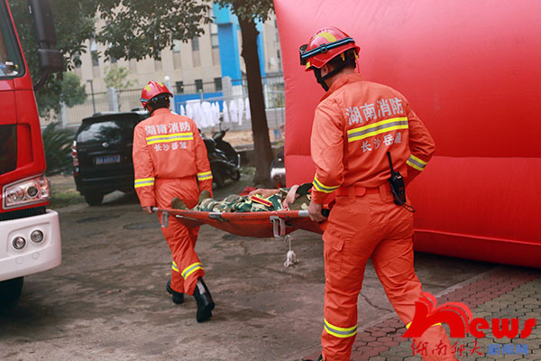 演习中,天马学生公寓16栋三四楼层冒出浓烟,火情发生。阳台上被困学生挥舞毛巾、衣服求救,并拨打火警电话(119),在老师的指挥下,同学们用湿毛巾捂住嘴鼻,有序从安全通道逃生。消防车呼啸而至,麓山门消防中队的消防官兵及时赶到进行救援,帮助被困学生逃离火灾现场,或协助同学跳上安全气垫,或用担架抬出受伤学生,最后将火扑灭。随后,麓山门消防中队李副中队长向同学们介绍学校教学楼、寝室及外出游玩时可能存在的火灾隐患和逃生技巧,并讲解了干粉灭火器和自动呼吸器的使用方法,让学生亲身体验如何灭火。参加演练的一名新生告诉记者,这次演练让他学到了很多知识,发生火灾时,一定要保持冷静,听从消防官兵和老师的指挥,是最重要的。据悉,此次消防演练是军训的一个重要内容,旨在提高同学们的防灾减灾意识,掌握一定的自救技巧。